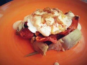 On a plate create a small stack of sweet potatoes in the center and surround it with sliced artichoke hearts. Place your poached egg in the center and drizzle hollandaise on top. Add a pinch of caramelized onions and a dash of smoked paprika and serve immediately.