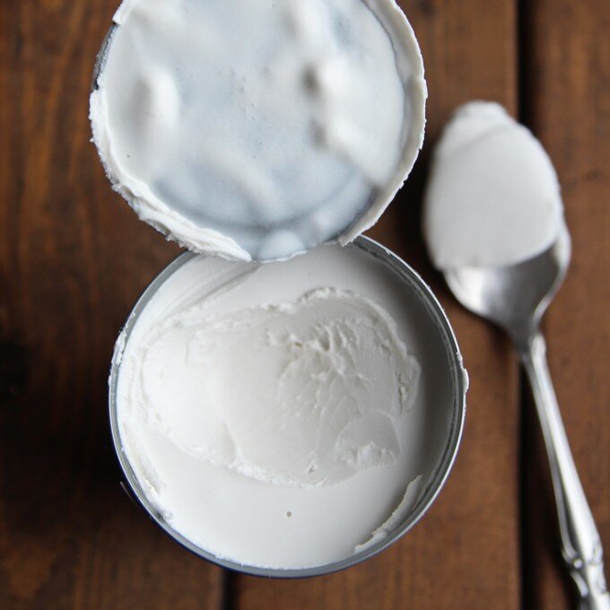 Begin by opening your chilled coconut milk cans and scooping out just the solid coconut cream layer that has solidified at the top of the can into a mixing bowl. Pour the leftover liquid into a container and save for another use (I add it to smoothies!)