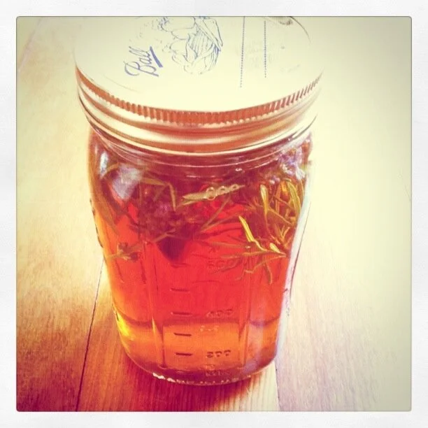 Brew sun tea using 1/2 gallon of water and fresh herbs. Let sit in sunny place for 1-2 days until a strong tea is brewed.